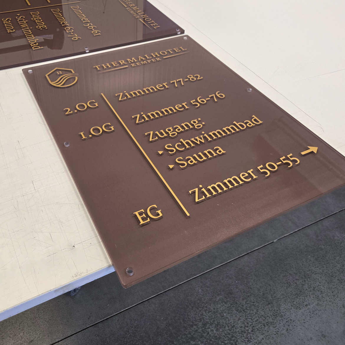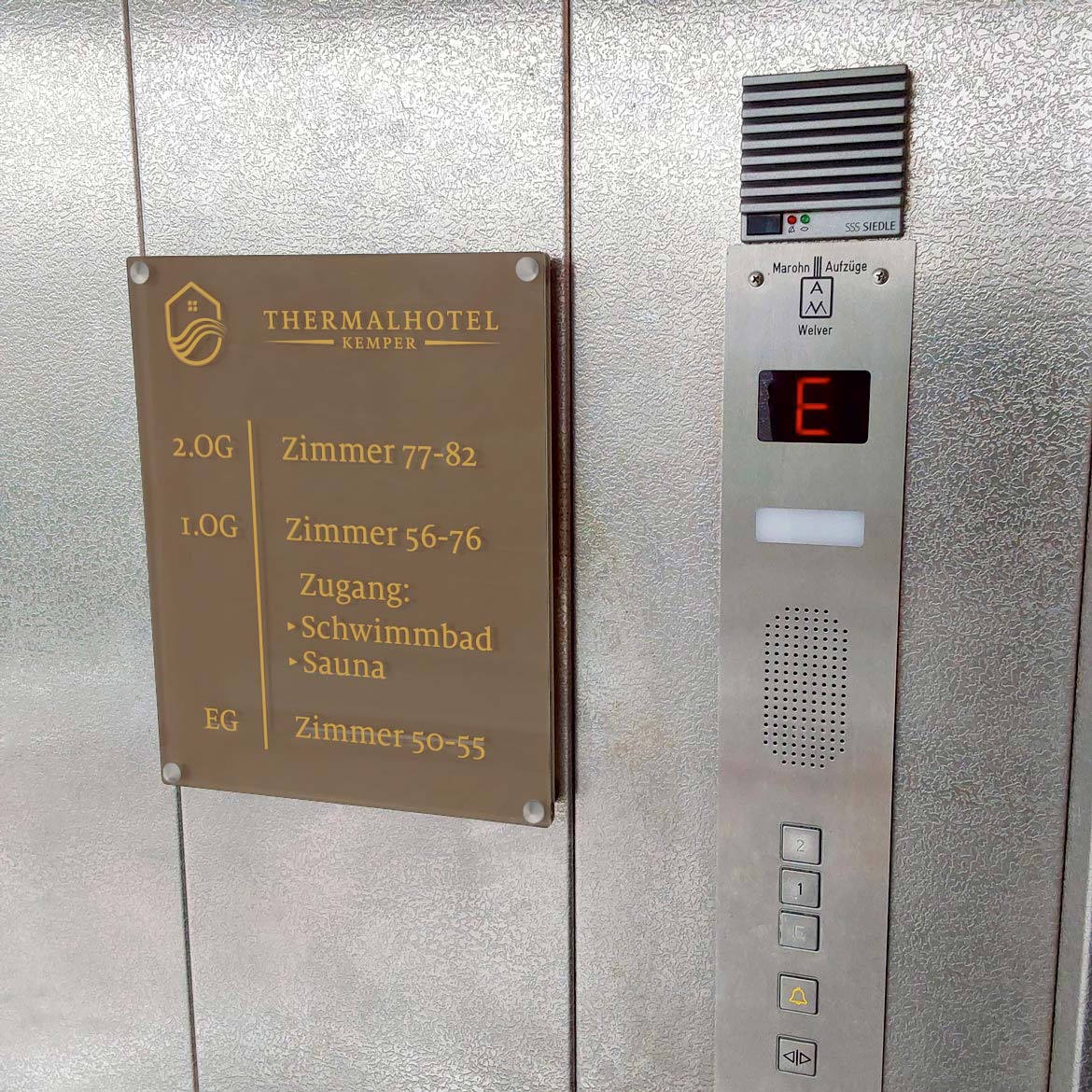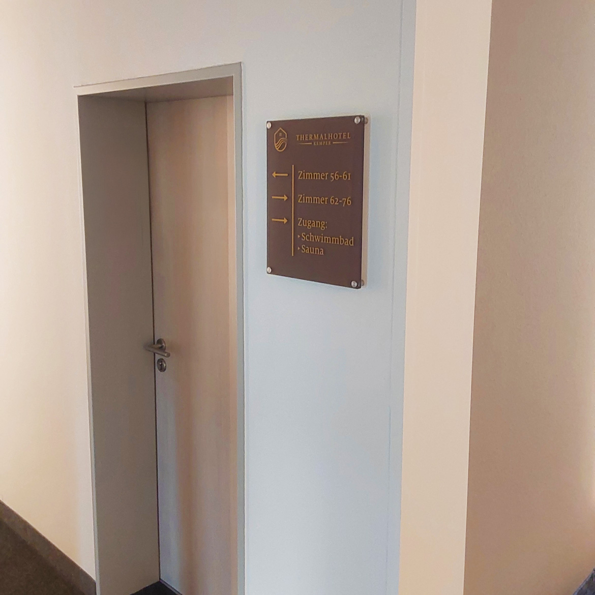 Auch im Innenbereich des Hotels realisierten wir eine klare und elegante Beschilderung. Mit stilvollen Türschildern, Etagenschildern und einer dezenten Scheibenbeklebung wurde eine dezente und dennoch wirkungsvolle Wegweisung geschaffen – abgestimmt auf das bestehende Gestaltungskonzept und in hochwertiger Ausführung gefertigt und montiert – für eine klare, unkomplizierte Orientierung im gesamten Innenbereich.