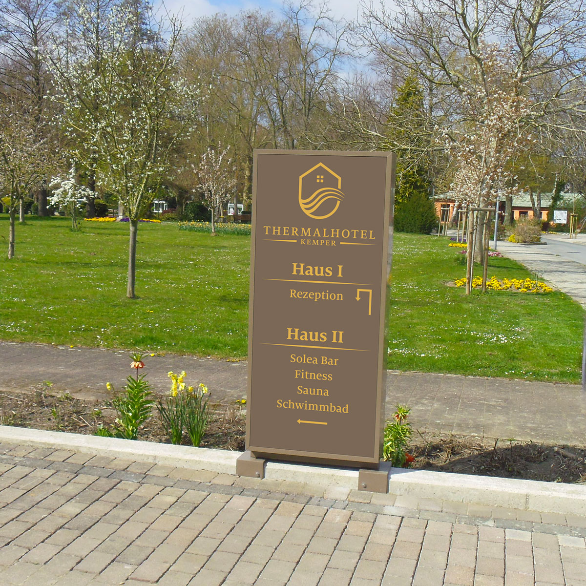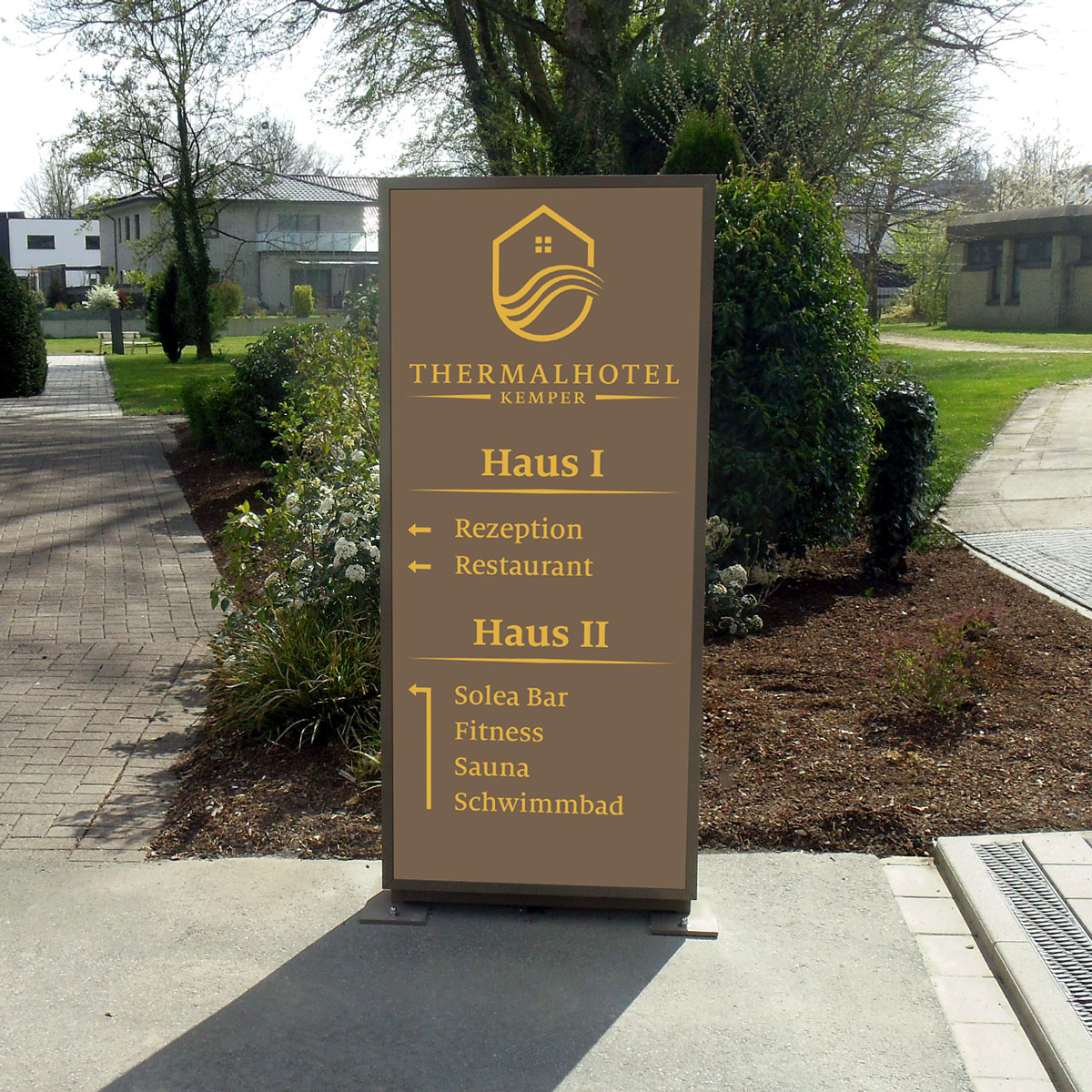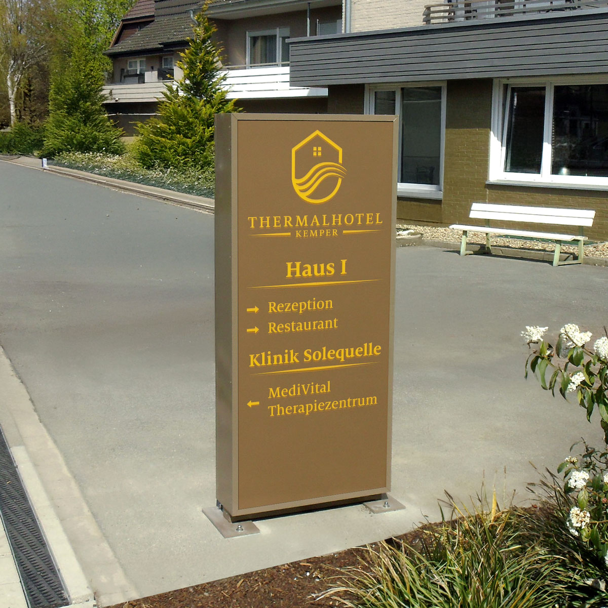 Ergänzend zu den bereits von uns gefertigten Leuchttransparenten haben wir nun doppelseitige, leuchtende Pylone für das Thermalhotel Kemper umgesetzt – individuell geplant, gefertigt und montiert.